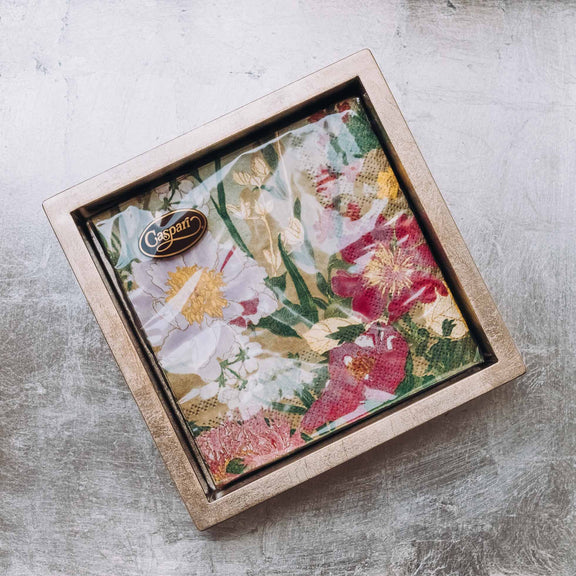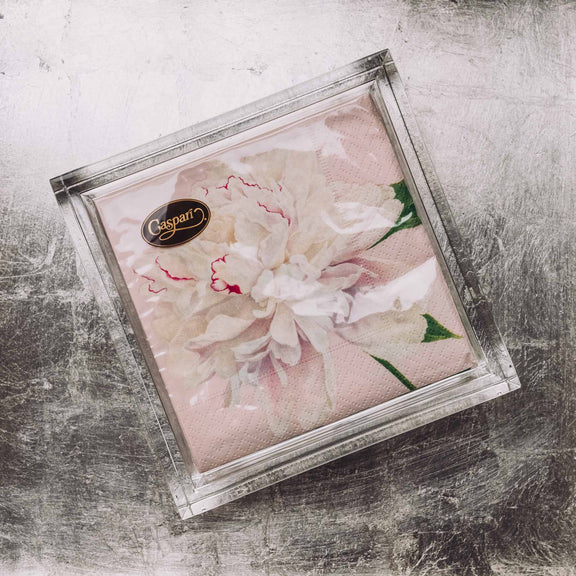 Add a touch of sophistication and elegance to your next party with our Caspari cocktail napkin holder. Made of high-quality acrylic or gold lacquered wood, this holder will keep your napkins neatly organized and easily accessible. Perfect for any occasion, it's the perfect addition to your entertainment collection. Available in Clear and Gold. 7.5 x 7.5. x 2.5 in