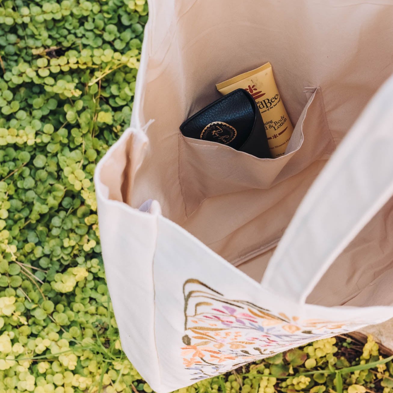 Introducing the Flower Market Tote Bag - a stylish and functional canvas tote with lining and an interior pocket for added space and organization. Choose from embroidered wildflowers or daisies for a touch of nature and beauty. Perfect for carrying all your essentials with ease and style! Available in 2 styles. 15 x 4 x 16 in