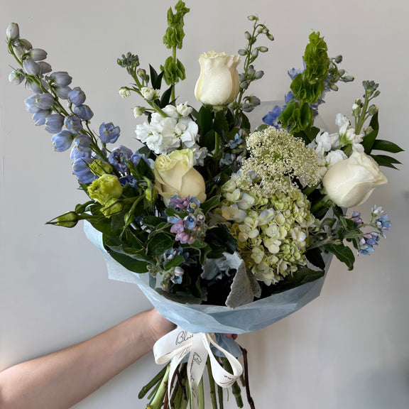Our charming Blossom & Vine Hand-Tied Bouquet radiates fresh, natural elegance. This delicate arrangement blends soft roses, hydrangeas, and stock, accented by glossy green leaves for a lush, garden-fresh look.